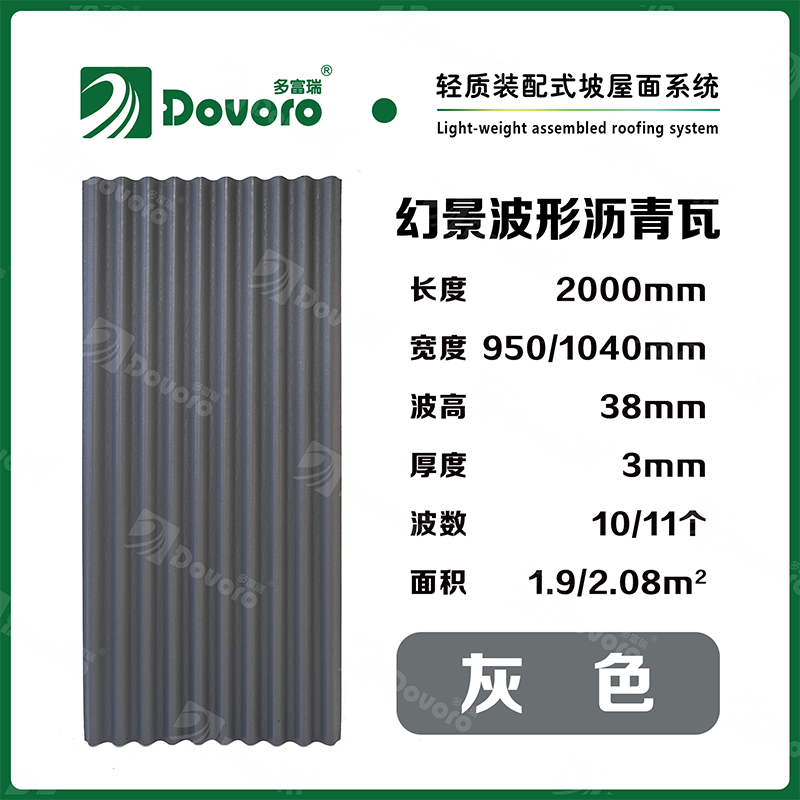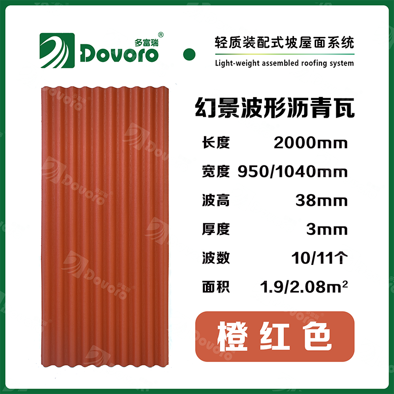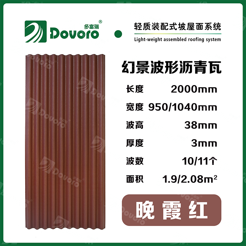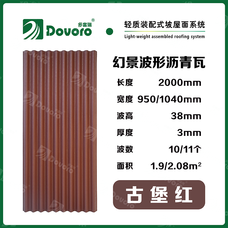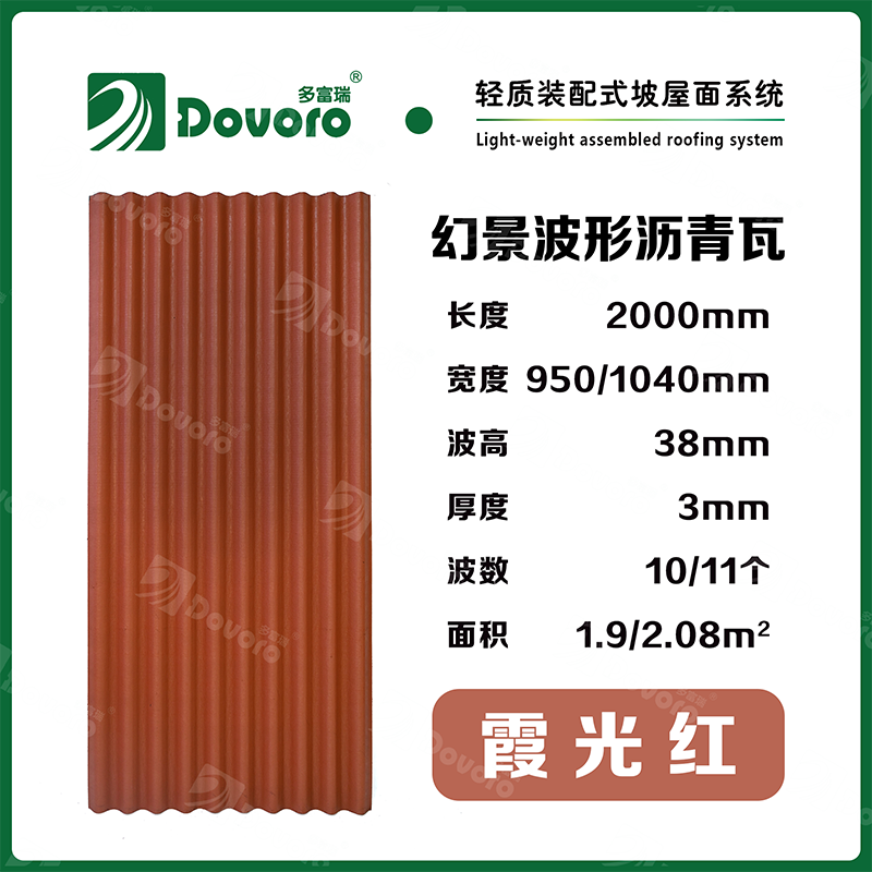 1、多富瑞幻景波形沥青瓦由矿植物纤维在高温高压下浸润沥青而成,瓦材整体更加牢固且具有很强的韧性,热固性树脂为材料保持强度;