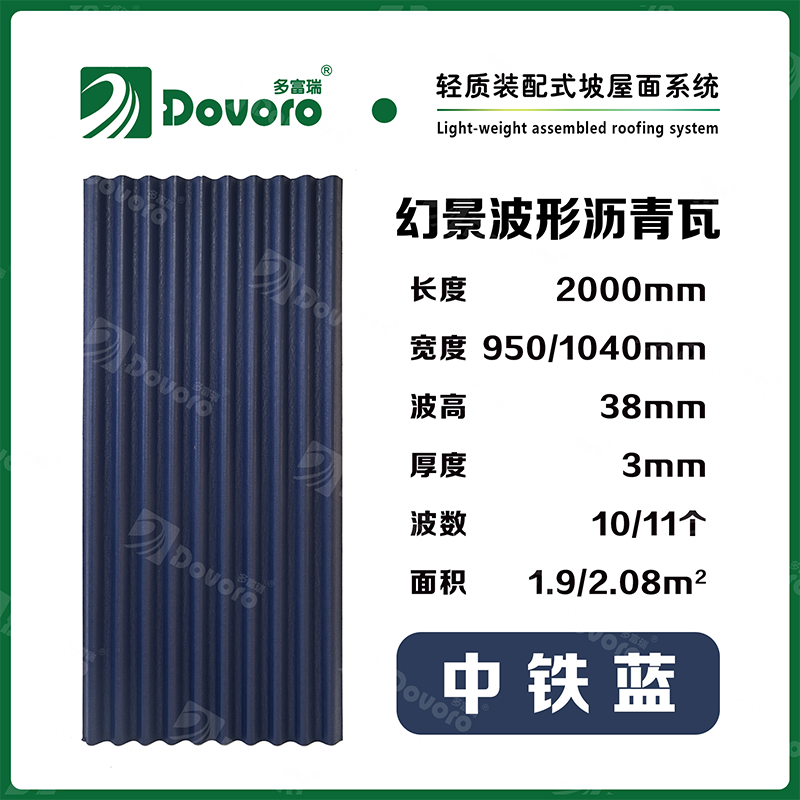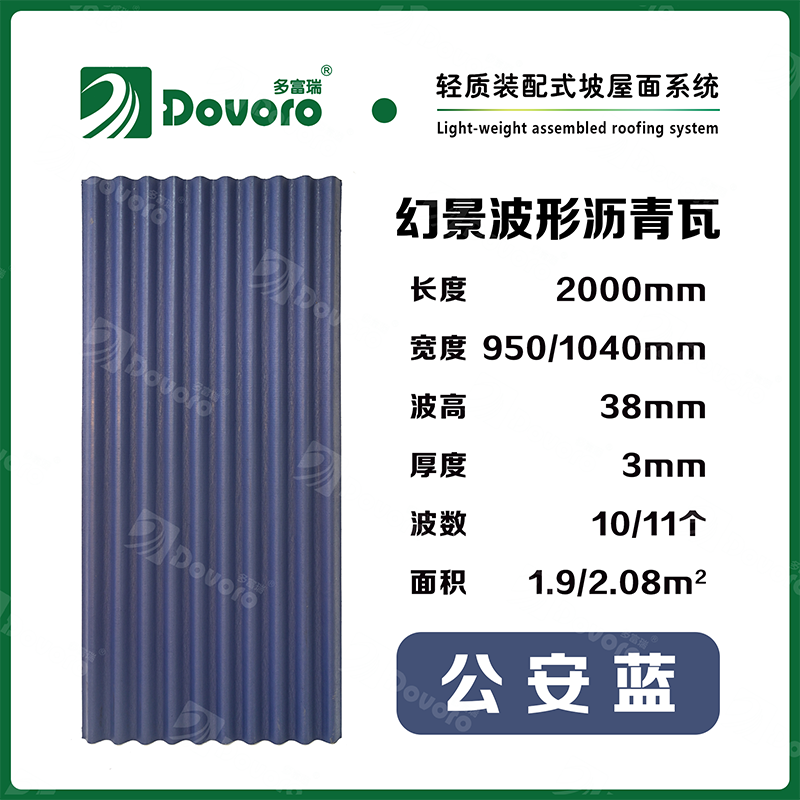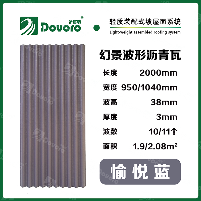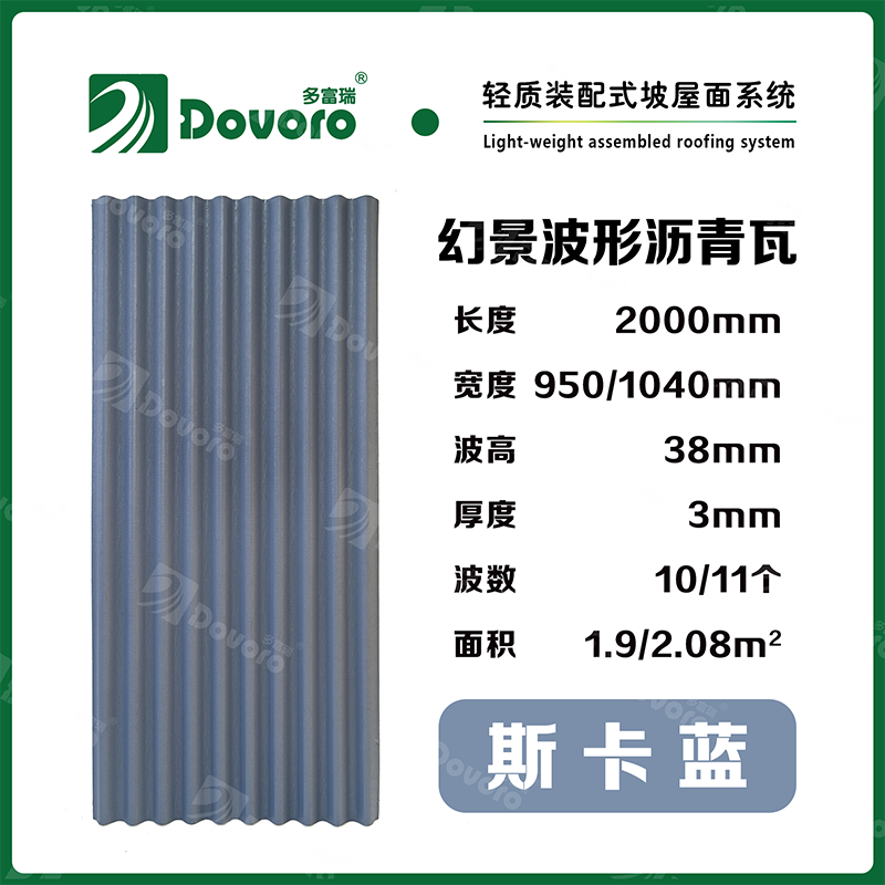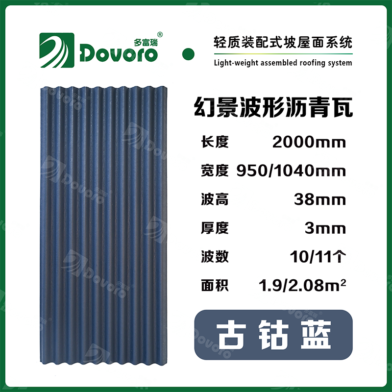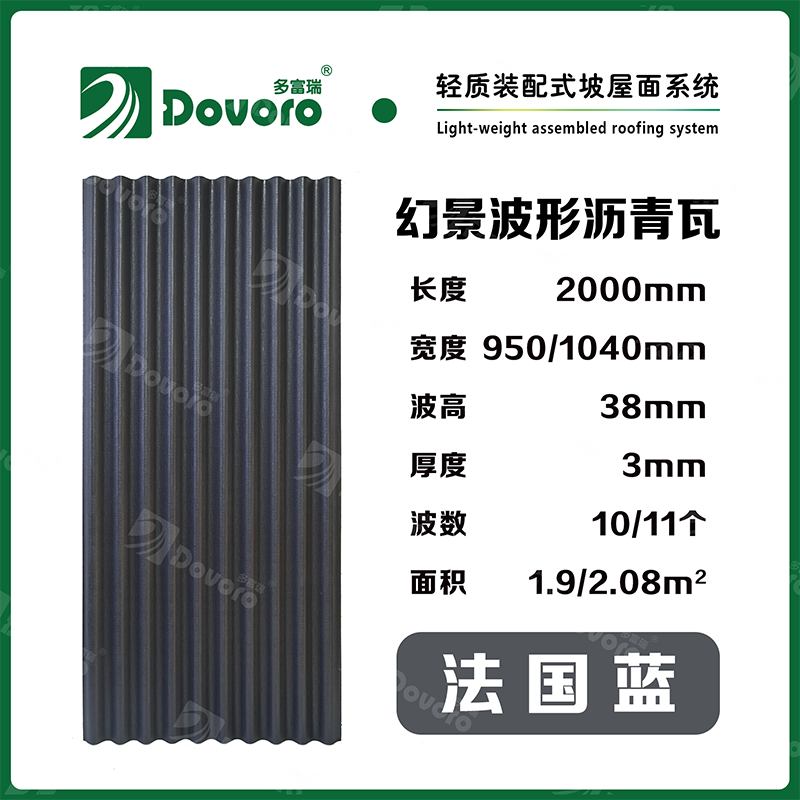 1、多富瑞幻景波形沥青瓦由矿植物纤维在高温高压下浸润沥青而成,瓦材整体更加牢固且具有很强的韧性,热固性树脂为材料保持强度;